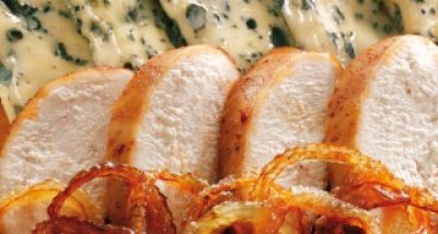 kuřecí steaky, sýr s modrou plísní, dressing, pečená cibulka