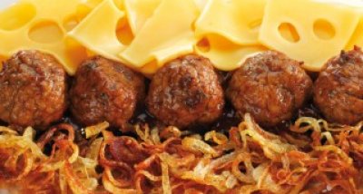masové koule, ementál, pečená cibulka, barbecue omáčka