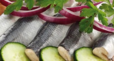 marinovaní sledi, hořčičný dressing, okurka, cibule, petržel