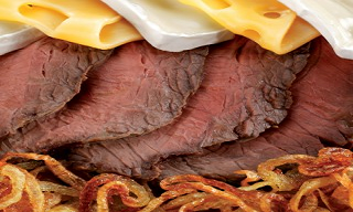 roastbeef, maasdamer, brie, pečená cibulka, křenový dressing